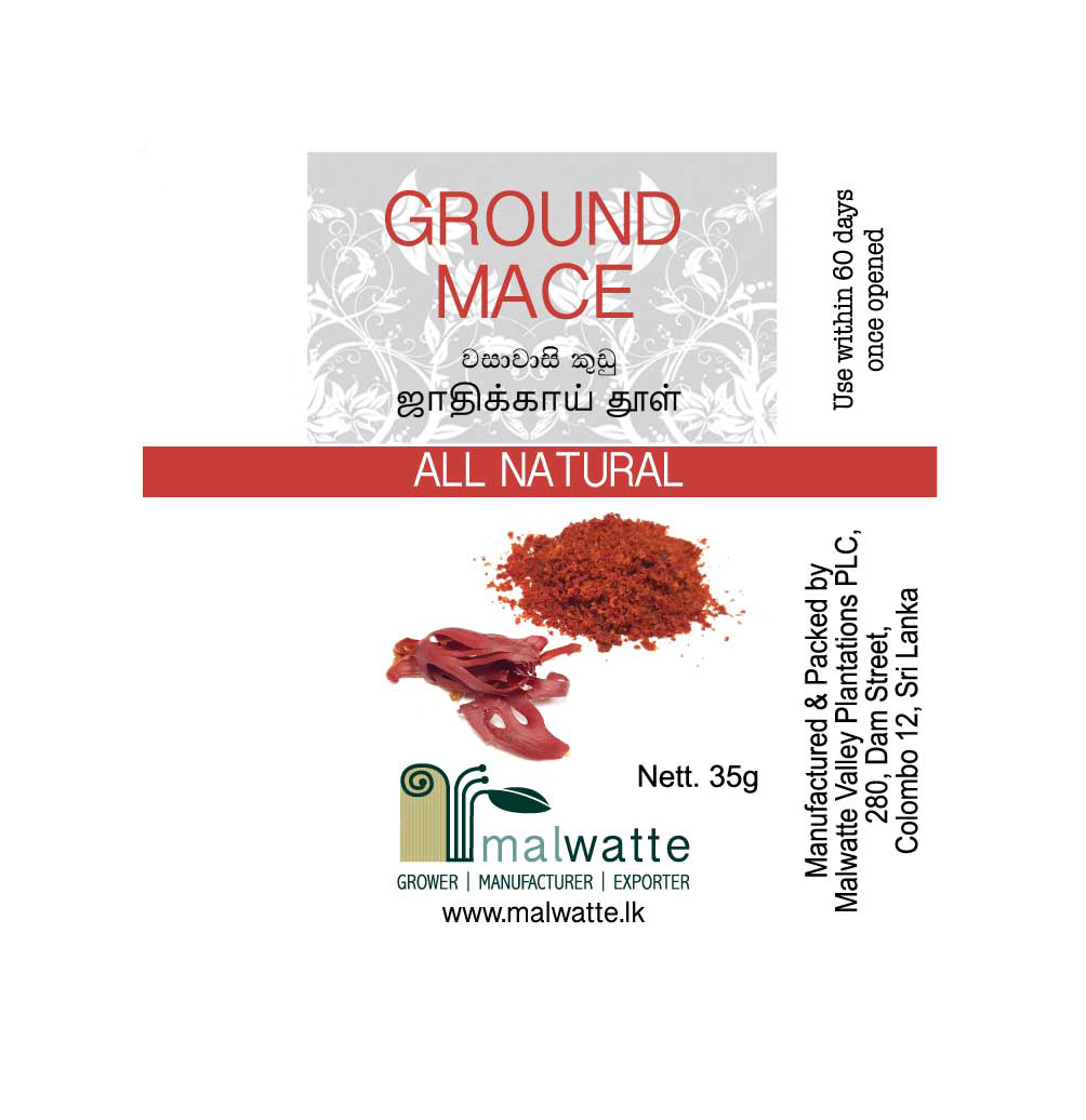 Malwatte Ground Mace is a spice made out of the waxy red covering which covers the nutmeg seeds. The taste is similar to that of nutmeg, including a hint of pepper. It has an overwhelming flavour thus should be used rather delicately.